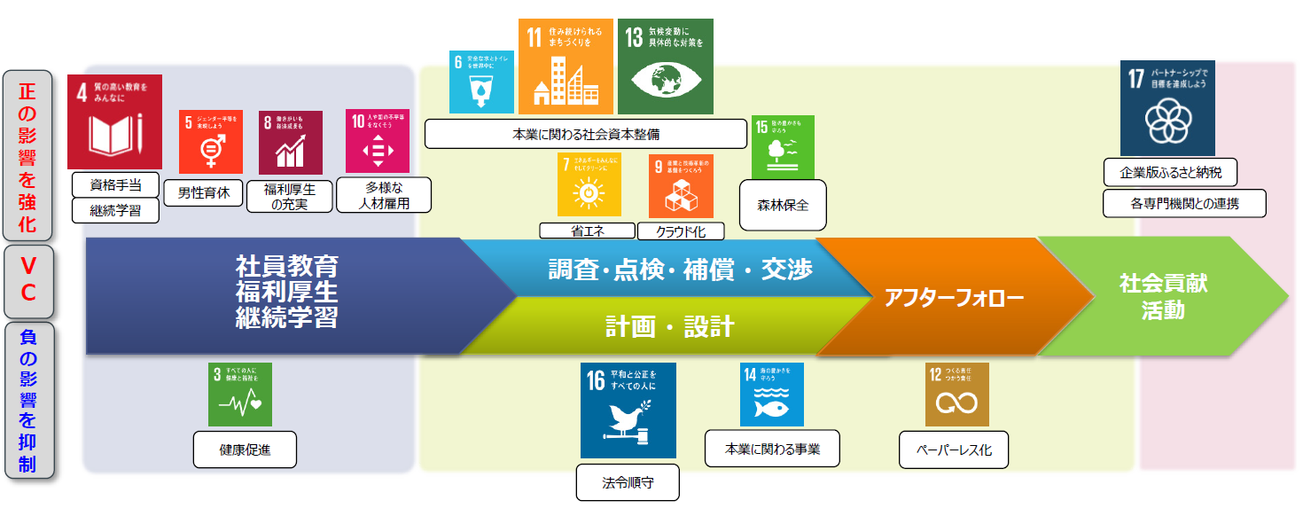 私たちの「仕事の流れ」とSDGsの関わりを「見える化」したものが「バリューチェーン」です。